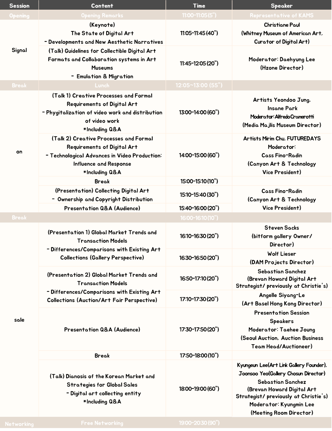 The first topic addressed strategies for collecting and trading digital art. Because digital media allows infinite replication, defining scarcity and originality has become a central challenge. Sanchez emphasized transparent on-chain contracts through minting, while Gyeongeun Lee advocated a viewing-experience–centered distribution model rather than reliance on physical editions. Joonsoo Yeo discussed exhibition-related technical constraints and strategies, including large-file management and long-term preservation using blockchain technologies and secure USB drives. The discussion then moved to community strategies. The panellists agreed that while a global distribution infrastructure for digital art is already in place, trust in collecting in Korea depends heavily on locally grounded communities attuned to linguistic and cultural contexts. Joonsoo Yeo noted that a gallery’s internal network functions as a community, strengthened through the interplay of online and offline engagement. Phygital sales strategies also emerged as a key focus. The panellists observed that combining physical exhibitions with digital interaction enhances audience immersion and can drive sales. However, they also noted that long-duration video works and installation-based pieces continue to face significant market challenges. Finally, the lack of technical, conservation, and installation infrastructure was identified as a structural barrier to market growth. Equipment maintenance, system updates, and repairs remain major obstacles for collectors, prompting calls for public-sector R&D initiatives and archival systems to address these gaps. Sanchez underscored the importance of practice-based, “on-the-job training” supported by concrete examples. The Q&A further highlighted positive evaluations of Korean galleries’ efforts, as well as growing collaboration with non-profit organizations.